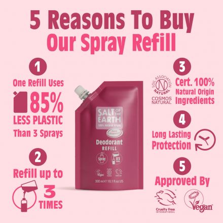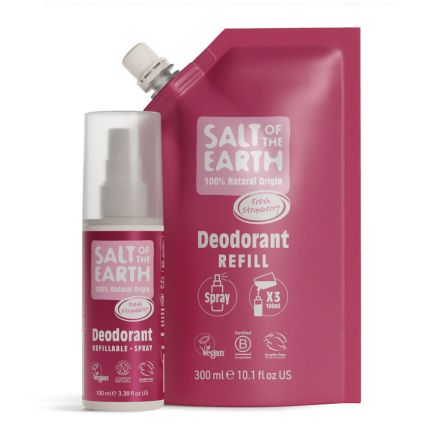 使用 Salt of the Earth 草莓 300 毫升天然除臭喷雾补充装,减少塑胶垃圾并节省资金